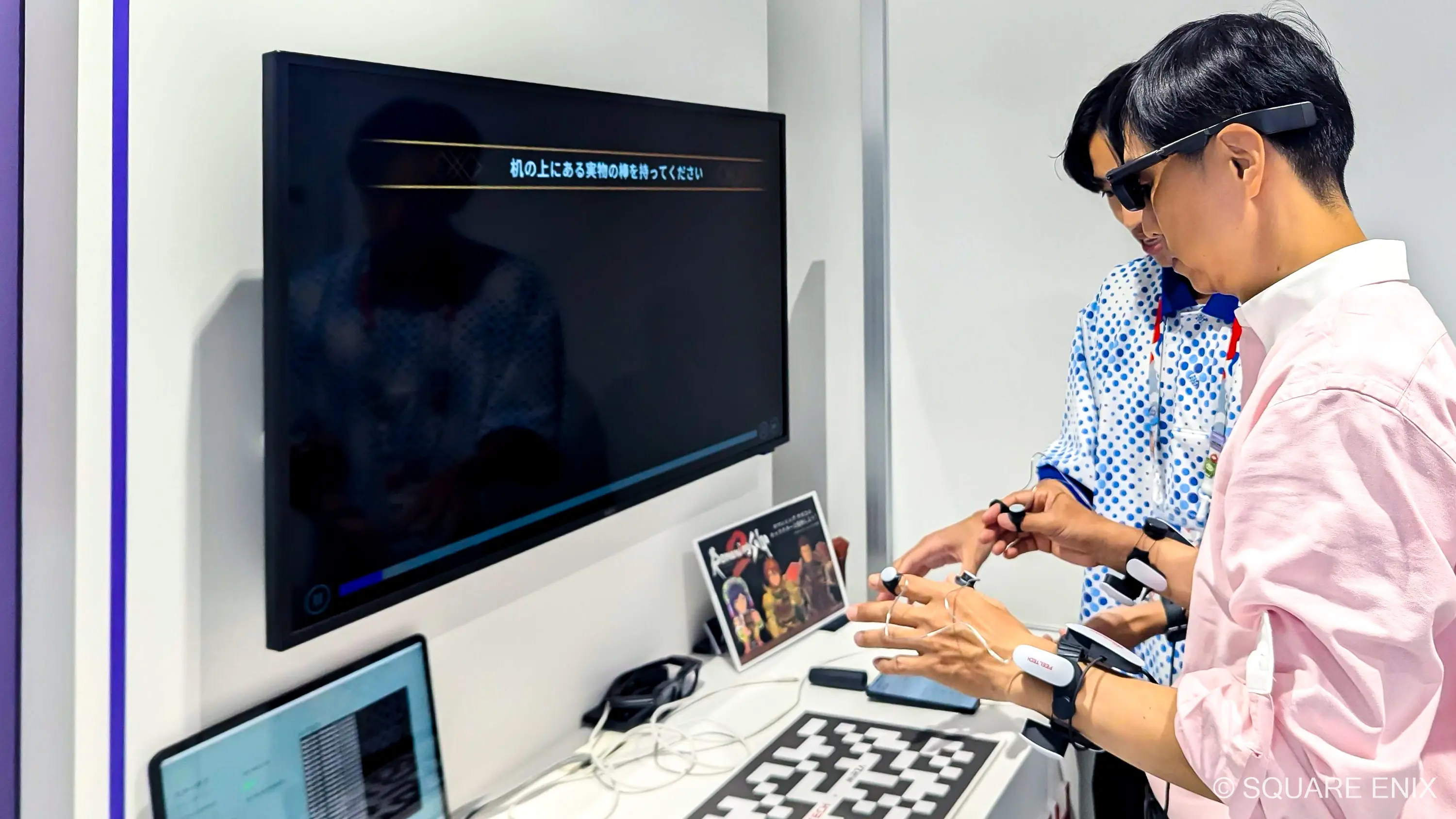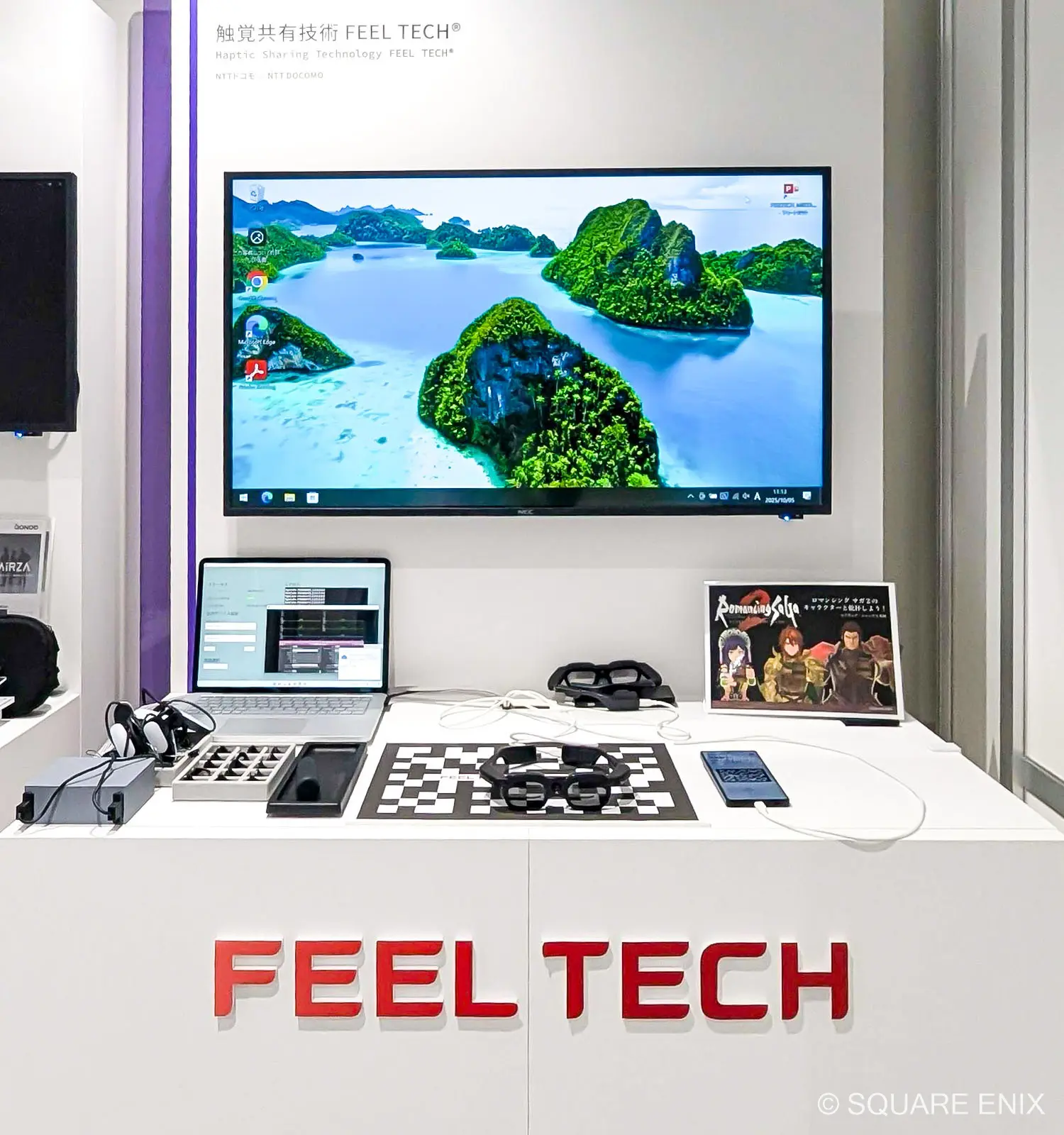 「FEEL TECH」と「MiRZA」を組み合わせ、「視覚・聴覚+触覚」という新次元のバーチャル体験が実現しました。『ロマンシング サガ2 リベンジオブザセブン』(※)の世界でキャラクターとの“ふれあい”をリアルな感触で楽しめる『ロマサガ酒場 』コンテンツ、ゲーム世界の魔法や衝撃をまるで現実のように体感できる『魔法演習』コンテンツ、感触の記憶を呼び覚まし、技能の再現・定着を支援する『フレッシュジュース』コンテンツの3つを体験することができました。
