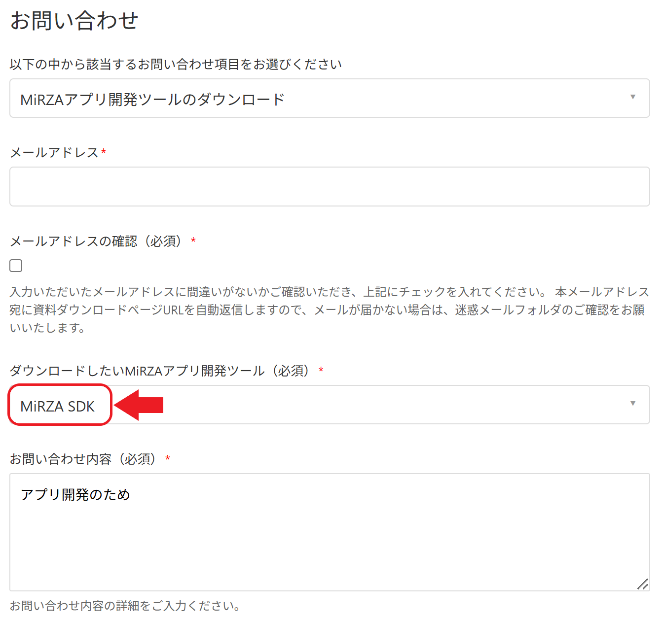 ダウンロードフォームにて「ダウンロードしたいMiRZAアプリ開発ツール:MiRZA SDK」をご選択のうえ、必要事項をご入力ください。
