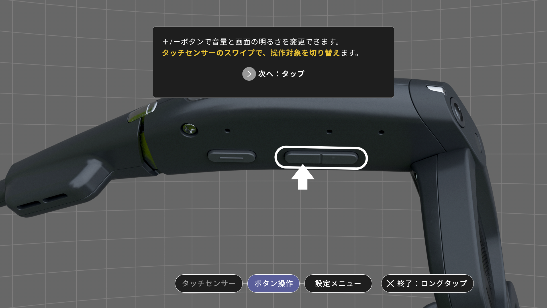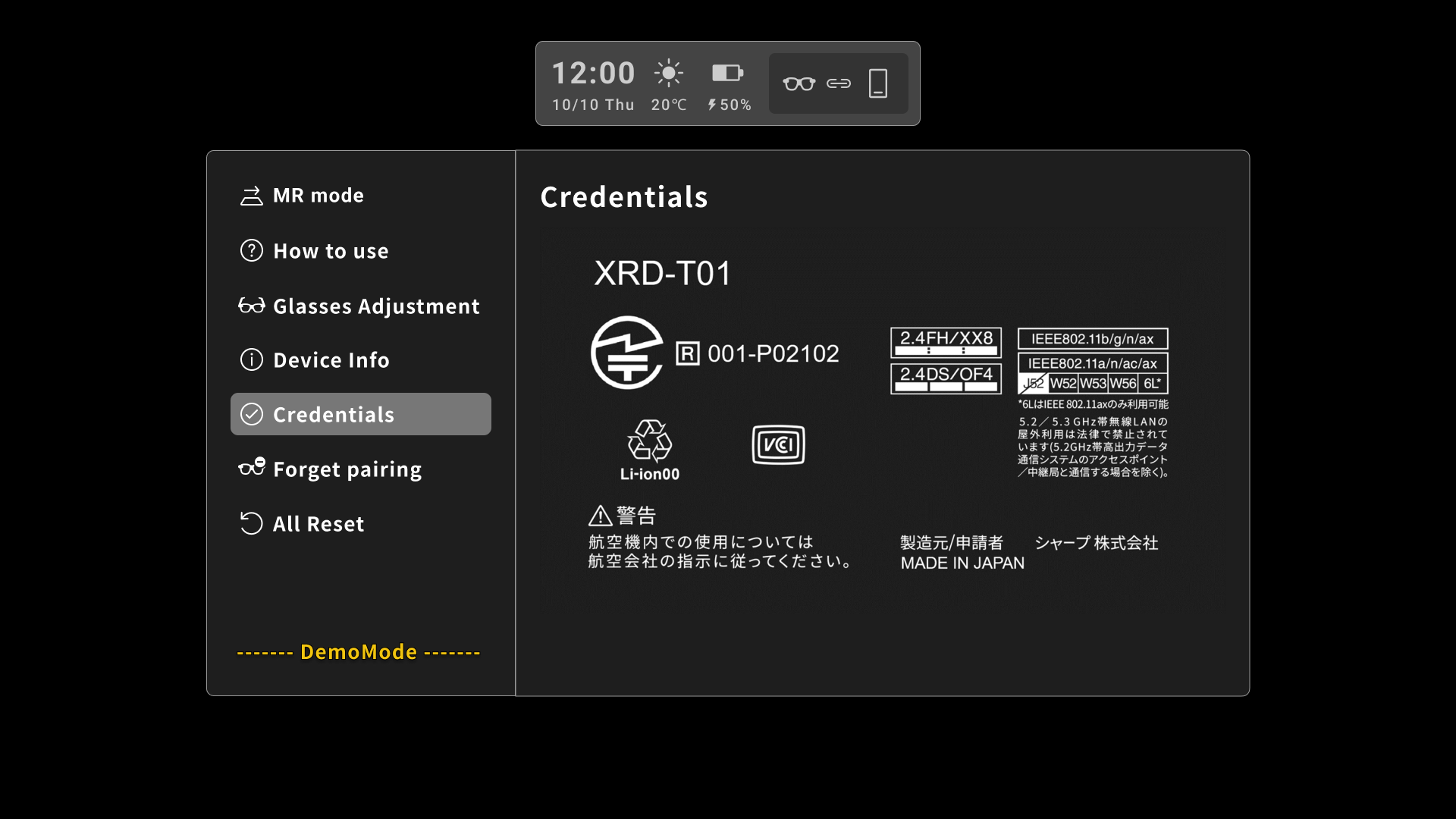 デモモードをONにするには、グラス本体の設定メニューで認証情報を表示した状態で+ボタンと-ボタンを同時に5秒押下してください。