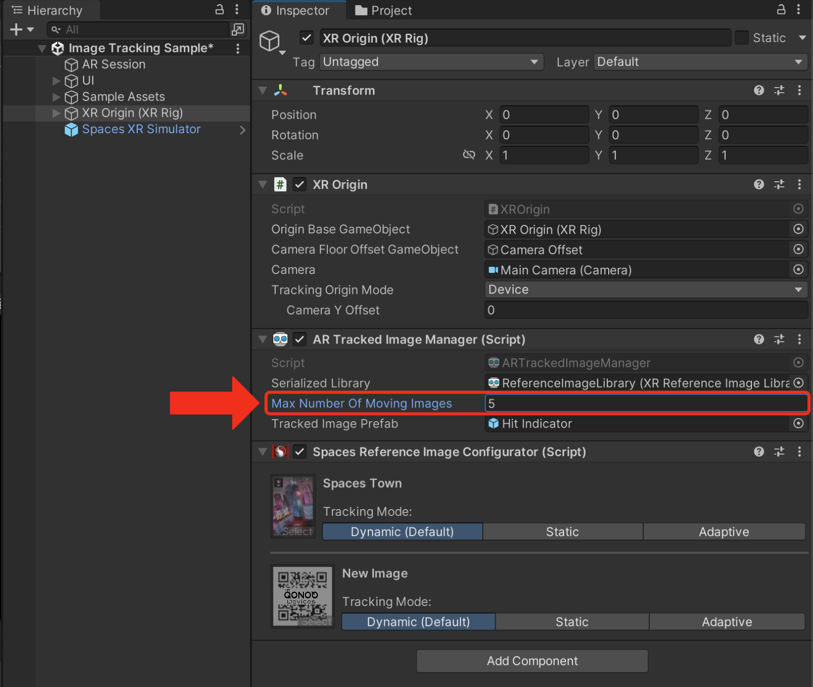 XR Origin (XR Rig)オブジェクトを選択します。AR Tracked Image Managerコンポーネントの「Max Number Of Moving Images」の値を指定します。- シーンを保存します。