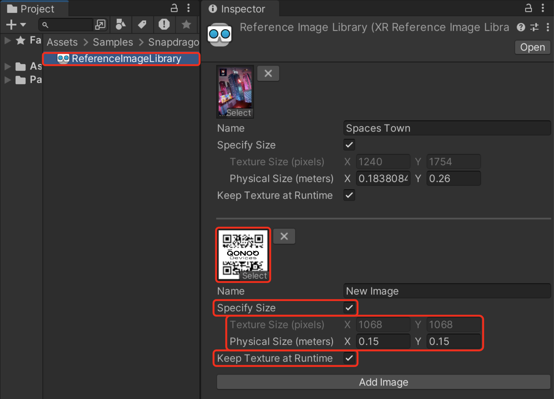追加された画像には、後でトラッキングされたターゲットを特定するのに便利な名前と、trueに設定する必要がある重要なKeep Texture at Runtimeフラグがあります。これによ り、サブシステムはトラッキングのためにテクスチャデータをSnapdragon Spaces Servicesに渡すことができます。