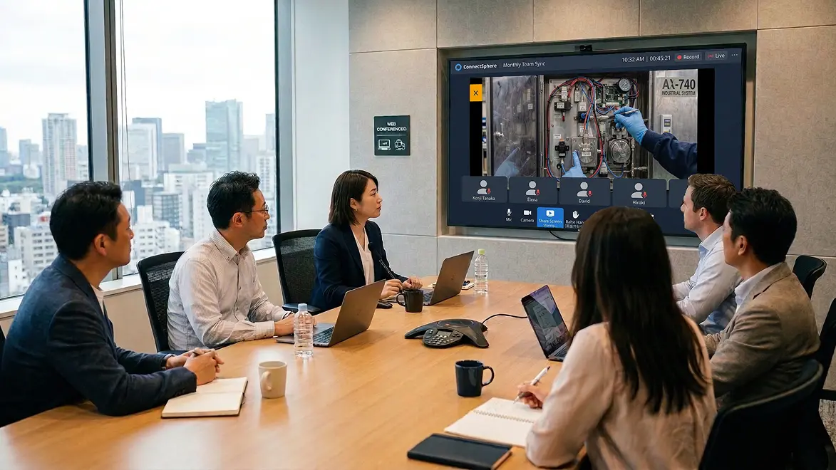 スマートフォンの会議アプリで画面共有機能を利用し、本アプリの画面を共有対象とすることで、MiRZAのRGBカメラ映像を会議参加者へ共有できます。共有中もスマートフォンのマイクおよびスピーカーは通常通りご使用いただけます。