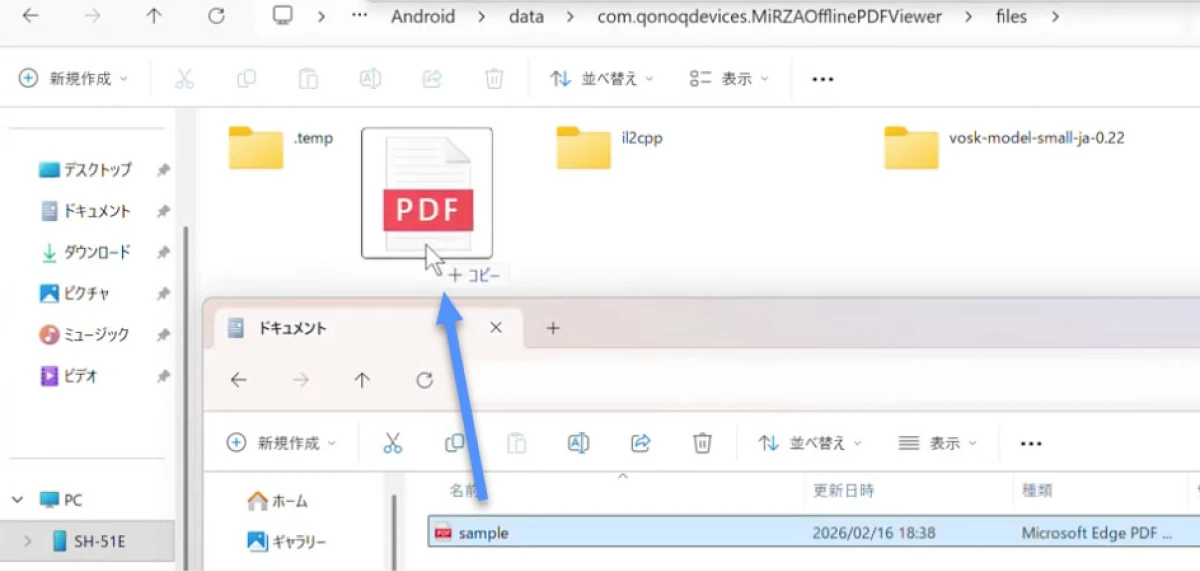 WindowsPCとスマートフォンをUSBで接続し、/Android/data/com.qonoqdevices.MiRZAOfflinePDFViewer/files/