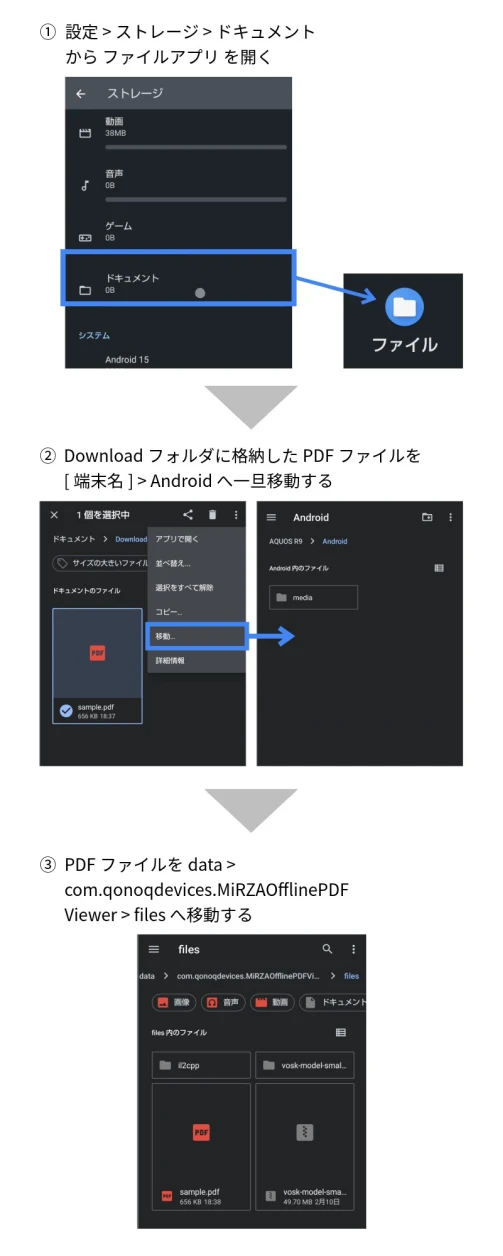 表示したいPDFファイルを、スマートフォン本体の以下のディレクトリに格納してください。/storage/emulated/0/Android/data/com.qonoqdevices.MiRZAOfflinePDFViewer/files/