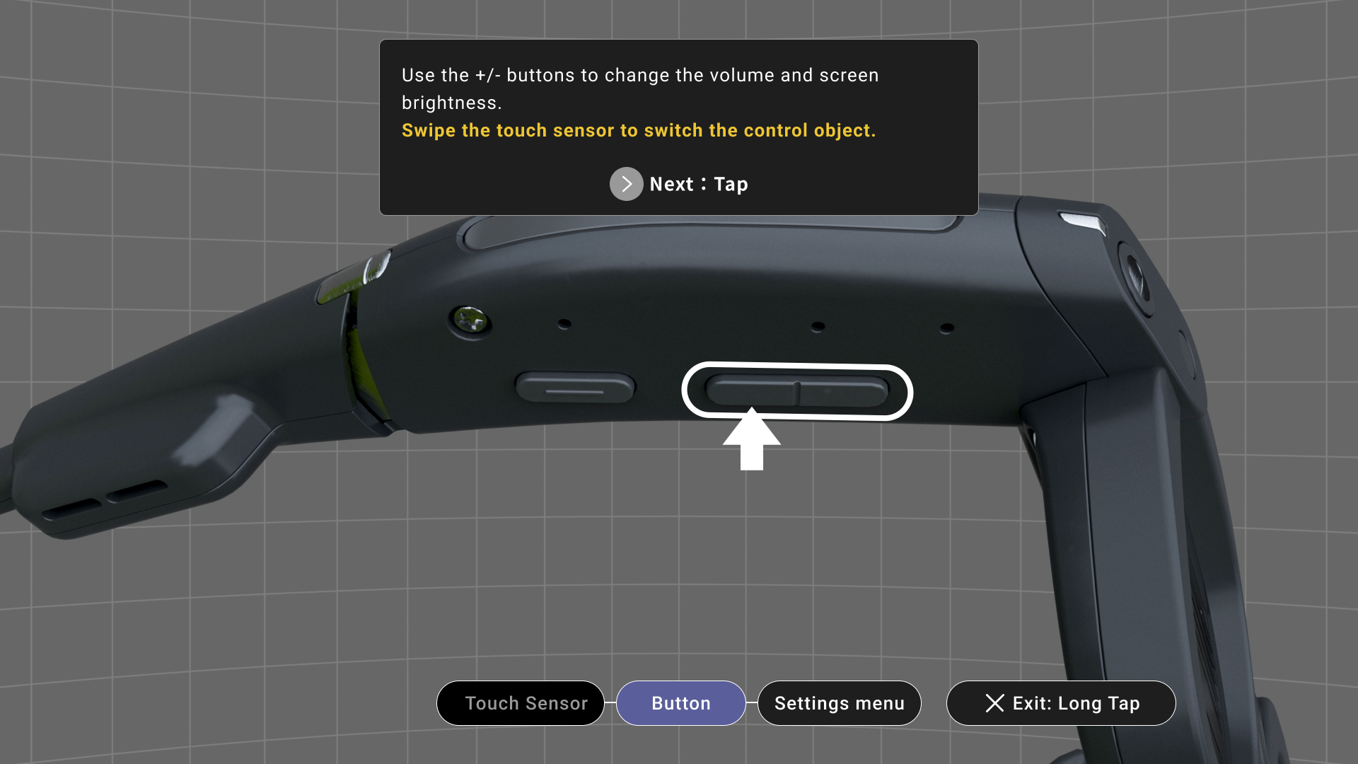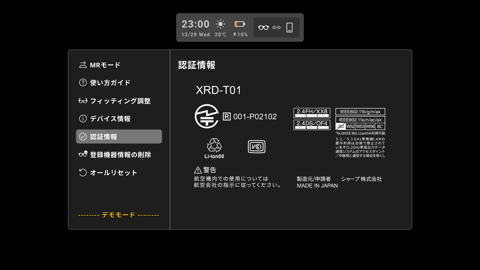 デモモードをONにするには、グラス本体の設定メニューで認証情報を表示した状態で+ボタンと-ボタンを同時に5秒押下してください。
