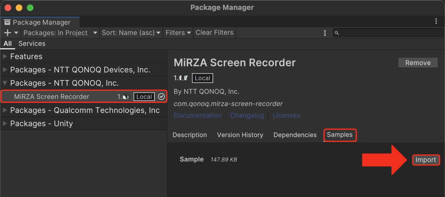 - 「MiRZAライブラリのUnityプロジェクトでの利用方法」の通りに、MiRZAライブラリをインポートします。